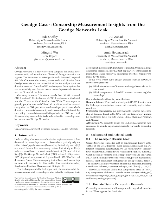 Abstract: Geedge Networks is a network security company that builds Internet censorship software for both China and foreign authoritarian regimes. The September 2025 Geedge Networks leak (GNL) exposed 572 GiB of internal documents, source code, and binaries from Geedge Networks and the related MESA lab. We analyze 6,915,266 domains extracted from the GNL and compare them against the two most widely used domain lists in censorship research: Tranco and the CitizenLab test lists. Our analysis across 5 locations reveals that 298,955 censored GNL domains (93.7% of all censored GNL domains) are not included in either Tranco or the CitizenLab lists. While Tranco captures globally popular sites and CitizenLab monitors sensitive content categories, the GNL provides a vendor-side perspective on which domains commercial censorship systems consider of interest. By correlating censored domains with filepaths in the GNL, we reveal files containing domain lists likely to be related to censorship done by customers of Geedge Networks.