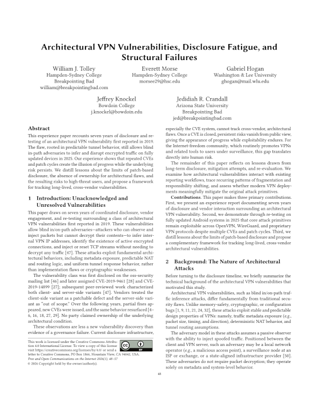 Abstract: This experience paper recounts seven years of disclosure and re- testing of an architectural VPN vulnerability first reported in 2019. The flaw, rooted in predictable tunnel behavior, still allows blind in-path adversaries to infer and disrupt encrypted traffic on fully updated devices in 2025. Our experience shows that repeated CVEs and patch cycles create the illusion of progress while the underlying risk persists. We distill lessons about the limits of patch-based disclosure, the absence of ownership for architectural flaws, and the resulting risks to high-threat users, and propose a framework for tracking long-lived, cross-vendor vulnerabilities.