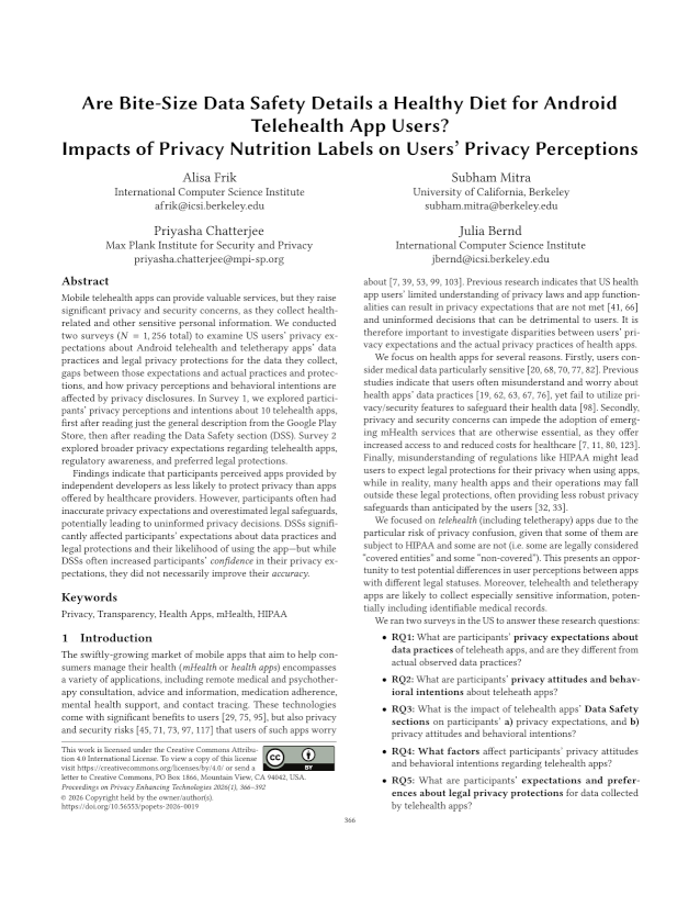 Abstract: Mobile telehealth apps can provide valuable services, but they raise significant privacy and security concerns, as they collect health-related and other sensitive personal information. We conducted two surveys (𝑁 = 1, 256 total) to examine US users’ privacy expectations about Android telehealth and teletherapy apps’ data practices and legal privacy protections for the data they collect, gaps between those expectations and actual practices and protections, and how privacy perceptions and behavioral intentions are affected by privacy disclosures. In Survey 1, we explored participants’ privacy perceptions and intentions about 10 telehealth apps, first after reading just the general description from the Google Play Store, then after reading the Data Safety section (DSS). Survey 2 explored broader privacy expectations regarding telehealth apps, regulatory awareness, and preferred legal protections. Findings indicate that participants perceived apps provided by independent developers as less likely to protect privacy than apps offered by healthcare providers. However, participants often had inaccurate privacy expectations and overestimated legal safeguards, potentially leading to uninformed privacy decisions. DSSs significantly affected participants’ expectations about data practices and legal protections and their likelihood of using the app—but while DSSs often increased participants’ confidence in their privacy expectations, they did not necessarily improve their accuracy.