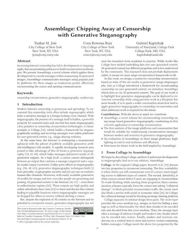 Abstract: Increasing Internet censorship has led to developments in steganography that are promising pathways to build circumvention technologies. We present Assemblage, a novel scheme which applies these developments to encode messages within unassuming AI-generated images. Assemblage communicates messages using popular public platforms for these images as rendezvous points, effectively circumventing the censor and opening communication.