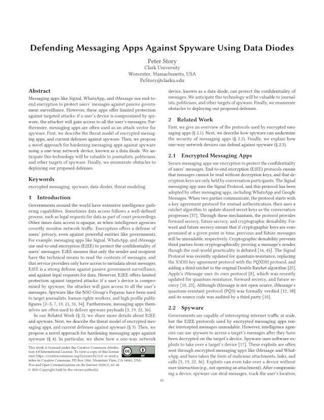 Abstract: Messaging apps like Signal, WhatsApp, and iMessage use end-to- end encryption to protect users’ messages against passive government surveillance. However, these apps offer limited protection against targeted attacks: if a user’s device is compromised by spyware, the attacker will gain access to all the user’s messages. Furthermore, messaging apps are often used as an attack vector for spyware. First, we describe the threat model of encrypted messaging apps, and current defenses against spyware. Then, we propose a novel approach for hardening messaging apps against spyware using a one-way network device, known as a data diode. We anticipate this technology will be valuable to journalists, politicians, and other targets of spyware. Finally, we enumerate obstacles to deploying our proposed defenses.