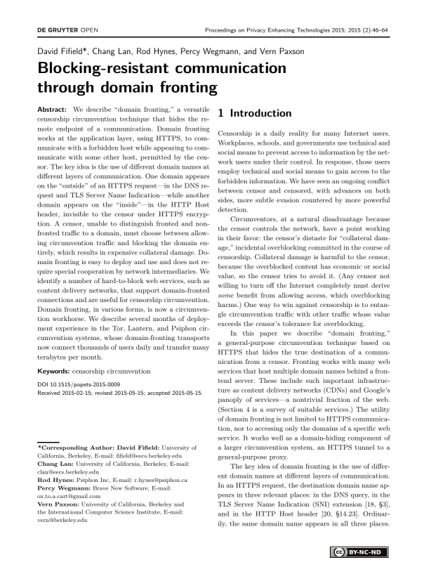 Abstract: We describe “domain fronting,” a versatile censorship circumvention technique that hides the remote endpoint of a communication. Domain fronting works at the application layer, using HTTPS, to communicate with a forbidden host while appearing to communicate with some other host, permitted by the censor. The key idea is the use of different domain names at different layers of communication. One domain appears on the “outside” of an HTTPS request—in the DNS request and TLS Server Name Indication—while another domain appears on the “inside”—in the HTTP Host header, invisible to the censor under HTTPS encryption. A censor, unable to distinguish fronted and nonfronted traffic to a domain, must choose between allowing circumvention traffic and blocking the domain entirely, which results in expensive collateral damage. Domain fronting is easy to deploy and use and does not require special cooperation by network intermediaries. We identify a number of hard-to-block web services, such as content delivery networks, that support domain-fronted connections and are useful for censorship circumvention. Domain fronting, in various forms, is now a circumvention workhorse. We describe several months of deployment experience in the Tor, Lantern, and Psiphon circumvention systems, whose domain-fronting transports now connect thousands of users daily and transfer many terabytes per month.