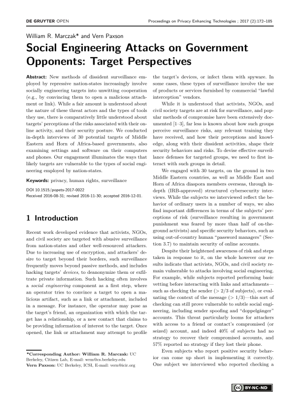 Abstract: New methods of dissident surveillance employed by repressive nation-states increasingly involve socially engineering targets into unwitting cooperation (e.g., by convincing them to open a malicious attachment or link). While a fair amount is understood about the nature of these threat actors and the types of tools they use, there is comparatively little understood about targets’ perceptions of the risks associated with their online activity, and their security posture. We conducted in-depth interviews of 30 potential targets of Middle Eastern and Horn of Africa-based governments, also examining settings and software on their computers and phones. Our engagement illuminates the ways that likely targets are vulnerable to the types of social engineering employed by nation-states.