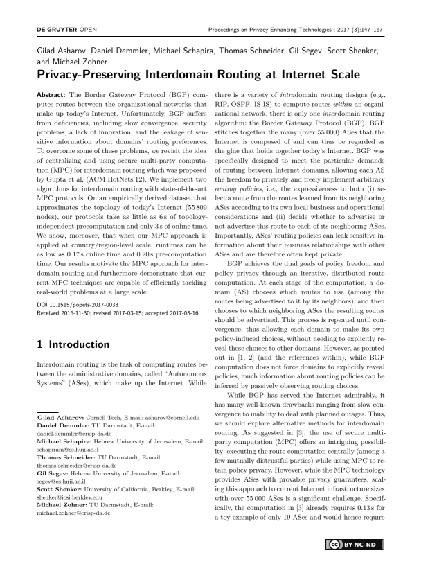 Abstract: The Border Gateway Protocol (BGP) computes routes between the organizational networks that make up today’s Internet. Unfortunately, BGP suffers from deficiencies, including slow convergence, security problems, a lack of innovation, and the leakage of sensitive information about domains’ routing preferences. To overcome some of these problems, we revisit the idea of centralizing and using secure multi-party computation (MPC) for interdomain routing which was proposed by Gupta et al. (ACM HotNets’12). We implement two algorithms for interdomain routing with state-of-the-art MPC protocols. On an empirically derived dataset that approximates the topology of today’s Internet (55 809 nodes), our protocols take as little as 6 s of topologyindependent precomputation and only 3 s of online time. We show, moreover, that when our MPC approach is applied at country/region-level scale, runtimes can be as low as 0.17 s online time and 0.20 s pre-computation time. Our results motivate the MPC approach for interdomain routing and furthermore demonstrate that current MPC techniques are capable of efficiently tackling real-world problems at a large scale.