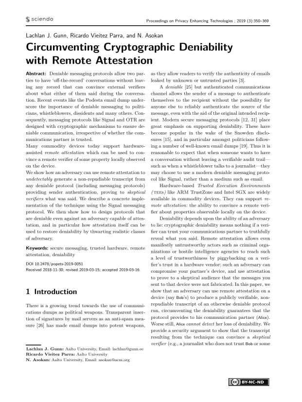 Abstract: Deniable messaging protocols allow two parties to have ‘off-the-record’ conversations without leaving any record that can convince external verifiers about what either of them said during the conversation. Recent events like the Podesta email dump underscore the importance of deniable messaging to politicians, whistleblowers, dissidents and many others. Consequently, messaging protocols like Signal and OTR are designed with cryptographic mechanisms to ensure deniable communication, irrespective of whether the communications partner is trusted. Many commodity devices today support hardwareassisted remote attestation which can be used to convince a remote verifier of some property locally observed on the device. We show how an adversary can use remote attestation to undetectably generate a non-repudiable transcript from any deniable protocol (including messaging protocols) providing sender authentication, proving to skeptical verifiers what was said. We describe a concrete implementation of the technique using the Signal messaging protocol. We then show how to design protocols that are deniable even against an adversary capable of attestation, and in particular how attestation itself can be used to restore deniability by thwarting realistic classes of adversary.