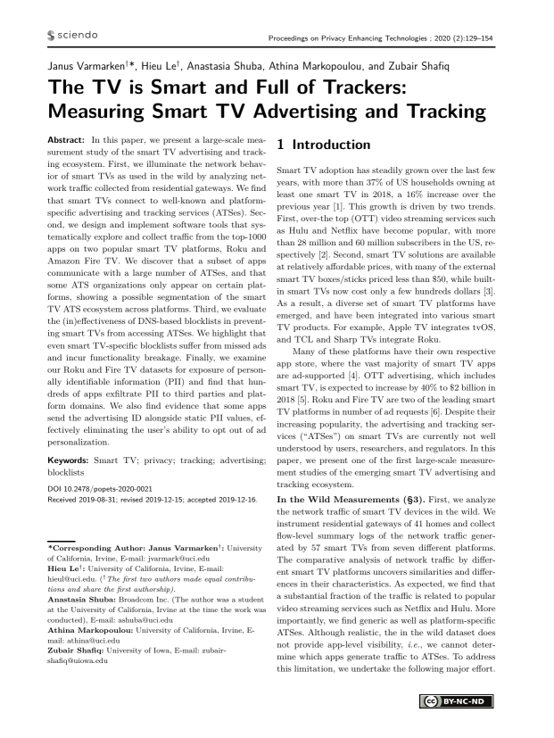 Abstract: In this paper, we present a large-scale measurement study of the smart TV advertising and tracking ecosystem. First, we illuminate the network behavior of smart TVs as used in the wild by analyzing network traffic collected from residential gateways. We find that smart TVs connect to well-known and platformspecific advertising and tracking services (ATSes). Second, we design and implement software tools that systematically explore and collect traffic from the top-1000 apps on two popular smart TV platforms, Roku and Amazon Fire TV. We discover that a subset of apps communicate with a large number of ATSes, and that some ATS organizations only appear on certain platforms, showing a possible segmentation of the smart TV ATS ecosystem across platforms. Third, we evaluate the (in)effectiveness of DNS-based blocklists in preventing smart TVs from accessing ATSes. We highlight that even smart TV-specific blocklists suffer from missed ads and incur functionality breakage. Finally, we examine our Roku and Fire TV datasets for exposure of personally identifiable information (PII) and find that hundreds of apps exfiltrate PII to third parties and platform domains. We also find evidence that some apps send the advertising ID alongside static PII values, effectively eliminating the user’s ability to opt out of ad personalization.