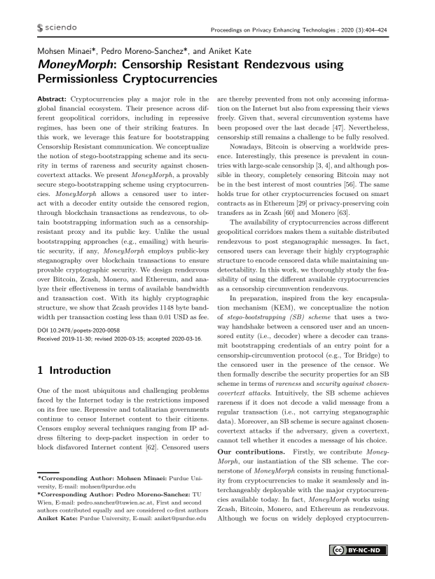 Abstract: Cryptocurrencies play a major role in the global financial ecosystem. Their presence across different geopolitical corridors, including in repressive regimes, has been one of their striking features. In this work, we leverage this feature for bootstrapping Censorship Resistant communication. We conceptualize the notion of stego-bootstrapping scheme and its security in terms of rareness and security against chosencovertext attacks. We present MoneyMorph, a provably secure stego-bootstrapping scheme using cryptocurrencies. MoneyMorph allows a censored user to interact with a decoder entity outside the censored region, through blockchain transactions as rendezvous, to obtain bootstrapping information such as a censorshipresistant proxy and its public key. Unlike the usual bootstrapping approaches (e.g., emailing) with heuristic security, if any, MoneyMorph employs public-key steganography over blockchain transactions to ensure provable cryptographic security. We design rendezvous over Bitcoin, Zcash, Monero, and Ethereum, and analyze their effectiveness in terms of available bandwidth and transaction cost. With its highly cryptographic structure, we show that Zcash provides 1148 byte bandwidth per transaction costing less than 0.01 USD as fee.