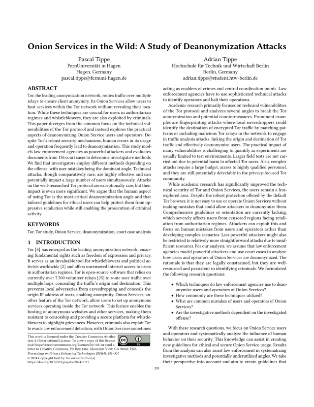 Abstract: Tor, the leading anonymization network, routes traffic over multiple relays to ensure client anonymity. Its Onion Services allow users to host services within the Tor network without revealing their location. While these techniques are crucial for users in authoritarian regimes and whistleblowers, they are also exploited by criminals. This paper diverges from the common focus on the technical vulnerabilities of the Tor protocol and instead explores the practical aspects of deanonymizing Onion Service users and operators. Despite Tor's robust security mechanisms, human errors in its usage and operation frequently lead to deanonymization. This study models law enforcement agencies as powerful attackers and evaluates documents from 136 court cases to determine investigative methods. We find that investigators employ different methods depending on the offense, with user mistakes being the dominant angle. Technical attacks, though comparatively rare, are highly effective and can potentially impact a large number of users simultaneously. Attacks on the well-researched Tor protocol are exceptionally rare, but their impact is even more significant. We argue that the human aspect of using Tor is the most critical deanonymization angle and that tailored guidelines for ethical users can help protect them from oppressive retaliation while still enabling the prosecution of criminal activity.