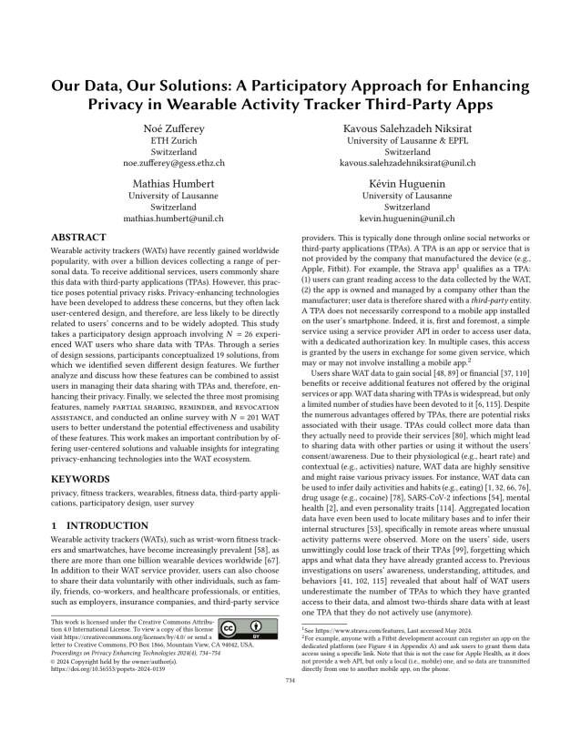 Abstract: Wearable activity trackers (WATs) have recently gained worldwide popularity, with over a billion devices collecting a range of personal data. To receive additional services, users commonly share this data with third-party applications (TPAs). However, this practice poses potential privacy risks. Privacy-enhancing technologies have been developed to address these concerns, but they often lack user-centered design, and therefore, are less likely to be directly related to users' concerns and to be widely adopted. This study takes a participatory design approach involving N=26 experienced WAT users who share data with TPAs. Through a series of design sessions, participants conceptualized 19 solutions, from which we identified seven different design features. We further analyze and discuss how these features can be combined to assist users in managing their data sharing with TPAs and, therefore, enhancing their privacy. Finally, we selected the three most promising features, namely partial sharing, reminder, and revocation assistance, and conducted an online survey with N=201 WAT users to better understand the potential effectiveness and usability of these features. This work makes an important contribution by offering user-centered solutions and valuable insights for integrating privacy-enhancing technologies into the WAT ecosystem.