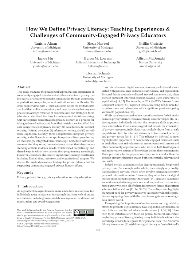 Abstract: This study examines the pedagogical approaches and experiences of community-engaged educators—individuals who teach privacy, online safety, or security to specific communities through community organizations, companies, or local institutions, such as libraries. We draw on interviews with 21 such educators across the United States and find that, unlike some privacy and security advice that may emphasize knowledge retention of common skills and strategies, these educators prioritized teaching for independent decision-making. Our participants conceptualized privacy literacy as a process for taking informed action, and, from their insights, we identified five core competencies of privacy literacy: (1) data fluency, (2) account security, (3) fraud detection, (4) information vetting, and (5) surveillance capitalism. Notably, these competencies integrate privacy, security, and online safety concepts into privacy literacy—reflecting an increasingly integrated threat landscape. Embedded within the communities they serve, these educators shared their deep understanding of their students’ needs, which varied dramatically, and shared ways in which they tailored their programming accordingly. However, educators also shared significant teaching constraints, including limited time, resources, and organizational support. We discuss the implications of our findings for privacy literacy and for supporting community-engaged privacy literacy efforts.